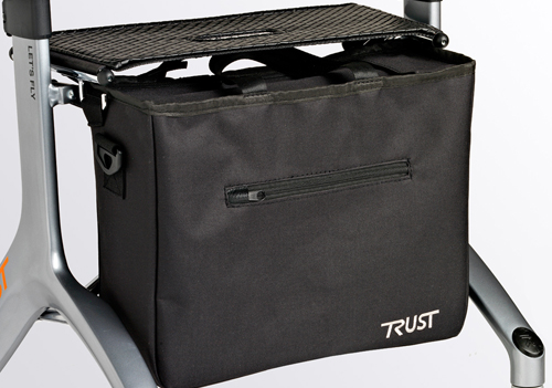 Väskan är tillverkad i svart kanvas och hängs lätt på rollatorn precis under sätet. Väskan har blixtlås och den kan lätt tas av och användas som shoppingväska.